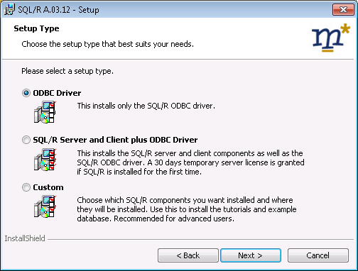 The SQL/R download for Windows platforms includes the ODBC driver as well as SQL/R server and client components. By default, only the ODBC driver will be selected for installation. This is sufficient for a PC client accessing an SQL/R and Eloquence server on another system.Note that installing only the ODBC driver does not require a license key.