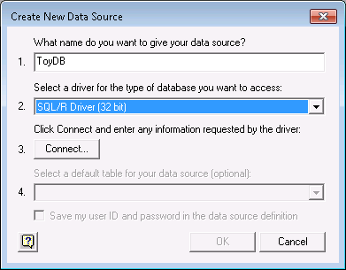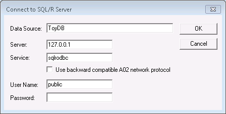The data source name (here "ToyDB") needs to match the data source name configured on the SQL/R server system (also see Getting started with SQL/R). You may need to ask your SQL/R server administrator for data source names configured for the desired Eloquence databases. This example uses an SQL/R server running on the same PC, so the target is localhost (or 127.0.0.1).