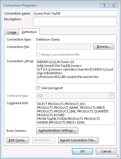 This is the "Definition" tab of the "Connection Properties" for above example: